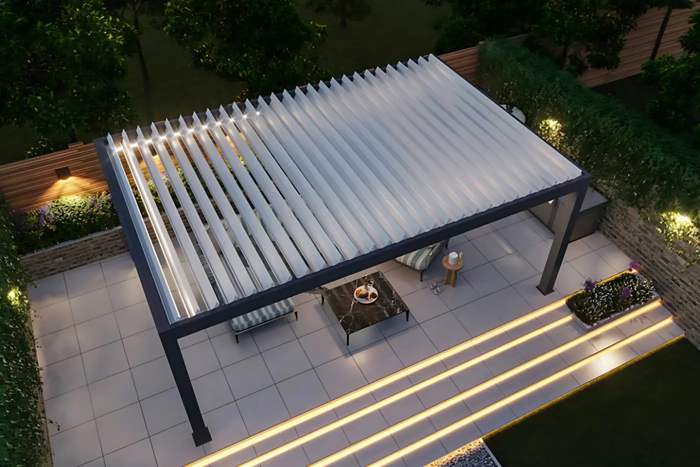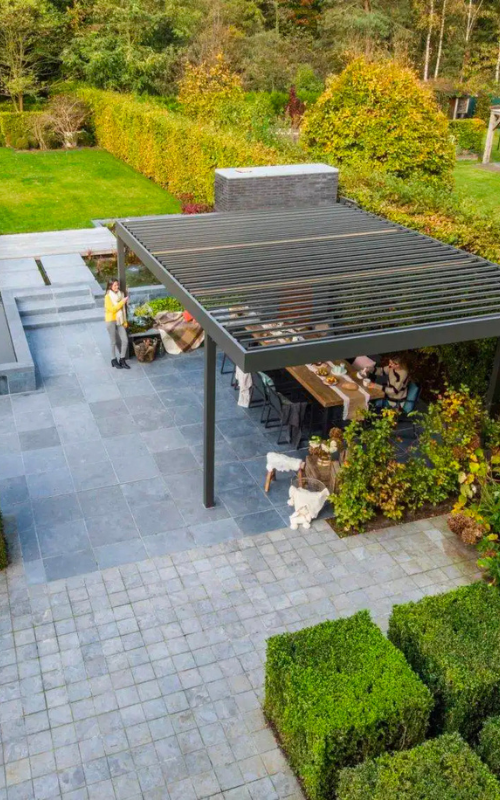 Le pergole bioclimatiche sono innovative grazie alle loro lamelle rotanti automatizzate, che permettono un controllo perfetto della luce naturale e della ventilazione in base al momento della giornata. Le lamelle intelligenti possono inclinarsi tra 0° e 140°, offrendo così protezione contro i raggi solari intensi e consentendo la ventilazione naturale dello spazio sottostante. Quando sono chiuse, le lamelle sono sigillate, proteggendo efficacemente contro l’infiltrazione dell’acqua piovana, e la loro operazione è semplice, realizzabile tramite telecomando.
